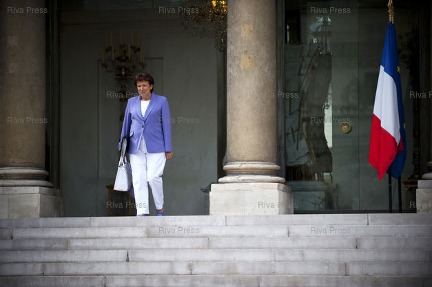 Légende : 29/07/2009 - PARIS, France - Roselyne Bachelot, ministre de la santé et des sports, sort du dernier conseil des ministres au palais de l'Elysée avant la trêve estivale.