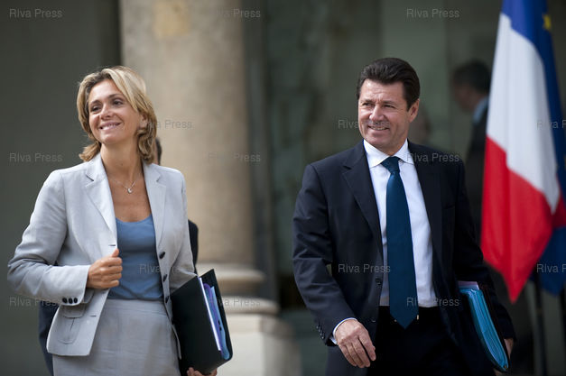 Légende : 29/07/2009 - PARIS, France - Valérie Pécresse, ministre de l'enseignement supérieur et de la recherche, et Christian Estrosi, ministre chargé de l'industrie, sortent du dernier conseil des ministres au palais de l'Elysée avant la trêve estivale.