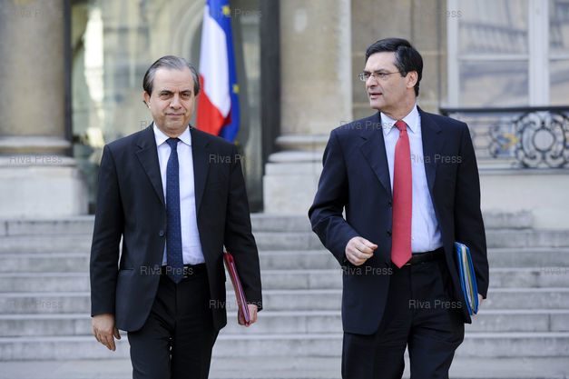 Légende : 25/02/2009 - PARIS, France - Roger Karoutchi, secretaire d'Etat charge des relations avec le parlement, et Patrick Devedjian, ministre en charge de la mise en oeuvre du plan de relance, sortent du conseil des ministres au palais de l'Elysee.