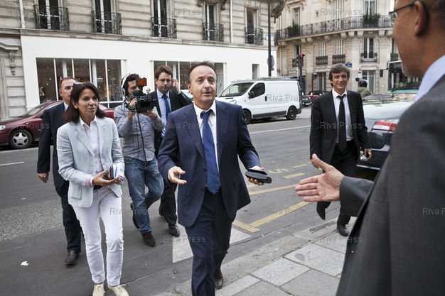 Légende : Paris, le 27 septembre 2011 - Jean-Pierre Bel (C), president du groupe PS au Senat et candidat a la presidence du Senat depuis la victoire de la gauche a l'election senatoriale de dimanche 25 septembre, est accueilli par Harlem Desir (D), premier secretaire par interim, au siege du Parti socialiste rue de Solferino pour participer au bureau national du PS. PHOTO: Vincent NGUYEN / Riva Press