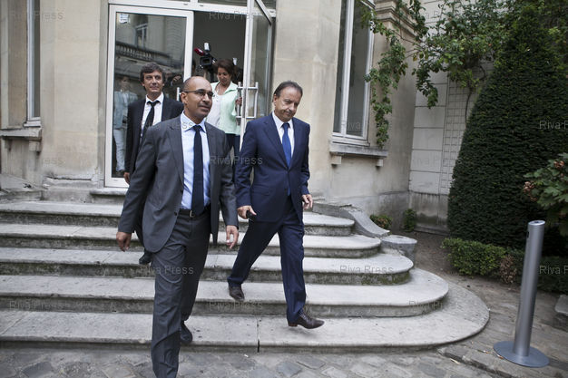 Légende : Paris, le 27 septembre 2011 - Jean-Pierre Bel (D), president du groupe PS au Senat et candidat a la presidence du Senat depuis la victoire de la gauche a l'election senatoriale de dimanche 25 septembre, est accueilli par Harlem Desir (1er plan), premier secretaire par interim, au siege du Parti socialiste rue de Solferino pour participer au bureau national du PS. PHOTO: Vincent NGUYEN / Riva Press