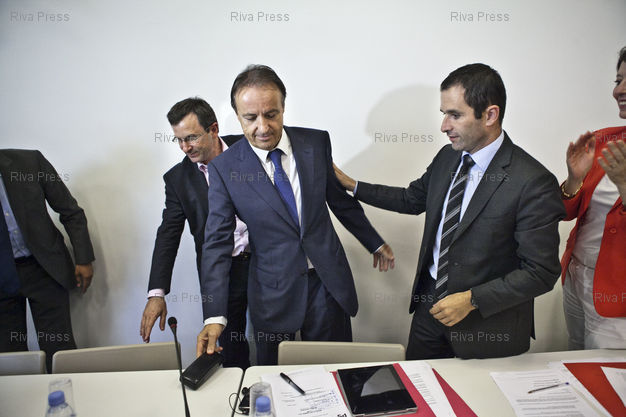 Légende : Paris, le 27 septembre 2011 - Jean-Pierre Bel (C), president du groupe PS au Senat et candidat a la presidence du Senat depuis la victoire de la gauche a l'election senatoriale de dimanche 25 septembre, est accueilli au siege du Parti socialiste rue de Solferino pour participer au bureau national du PS. Avec Benoit Hamon (D) et Christophe Borgel (G). PHOTO: Vincent NGUYEN / Riva Press