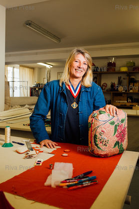 Légende : Laurence Raverdeau, MOF (Meilleur Ouvrier de France) courtepointiere, dans son atelier, a Paris, le 4 octobre 2021. © Lucien Lung / Riva-Press