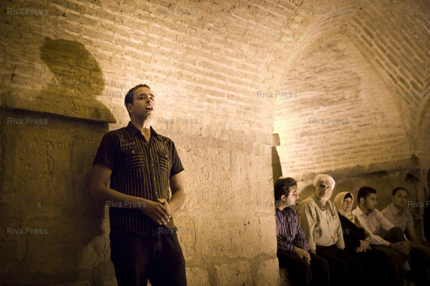 Légende : 10/05/2009 - ISPAHAN, Iran - Comme chaque soir sous les voutes du pont Khaju (1650), des hommes entonnent des chants traditionnels iraniens devant une foule nombreuse et mixte venue les ecouter. /// Young men stand and sing in the evening under the Khaju bridge .