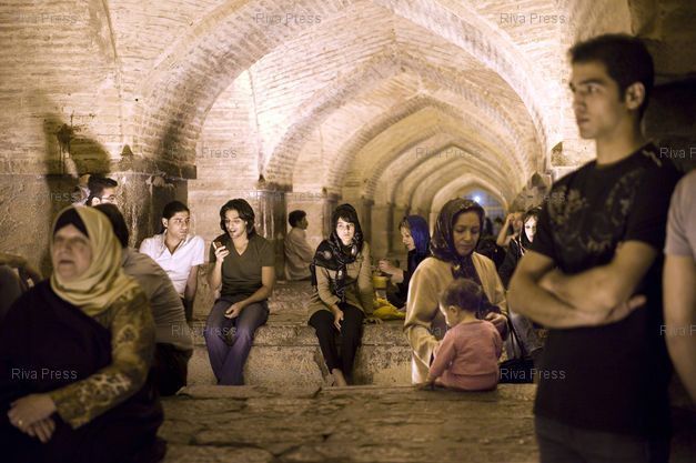 Légende : 10/05/2009 - ISPAHAN, Iran - Comme chaque soir sous les voutes du pont Khaju (1650), des hommes entonnent des chants traditionnels iraniens devant une foule nombreuse et mixte venue les ecouter. /// Young men stand and sing in the evening under the Khaju bridge .