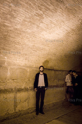 Légende : 10/05/2009 - ISPAHAN, Iran - Comme chaque soir sous les voutes du pont Khaju (1650), des hommes entonnent des chants traditionnels iraniens devant une foule nombreuse et mixte venue les ecouter. /// Young men stand and sing in the evening under the Khaju bridge .