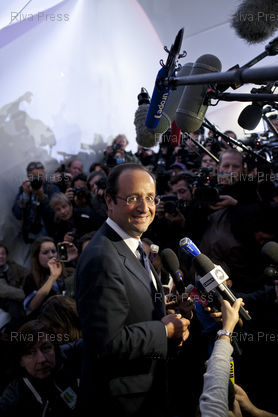 *** Paris, FRANCE, October 9, 2011 - Francois Hollande makes an official declaration at the socialist party headquarters at the end of the 1st round of the socialist primary election. PHOTO: Vincent NGUYEN / Riva Press