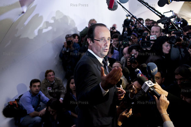 Légende : Paris, le 9 octobre 2011 - Francois Hollande fait une declaration au siege du PS rue de Solferino en fin de soiree du 1er tour de l'election primaire du Parti socialiste. PHOTO: Vincent NGUYEN / Riva Press ***