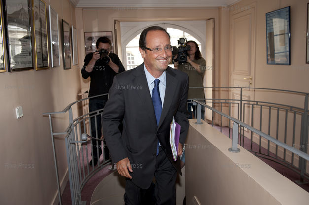 Légende : 24/08/2011 - PARIS, France - Francois Hollande fait une conference de presse a la Maison de l'Amerique Latine, au terme d'une reunion de plusieurs economistes destinee a trouver des pistes pour "sortir de la crise". /// Francois Hollande, candidate for the 2011 Socialist Party primary election before 2012 presidential election, addresses journalists during a press conference focused on the eurozone debt crisis at the Maison de l'Amerique Latine. /// PHOTO Vincent Boisot/Riva Press