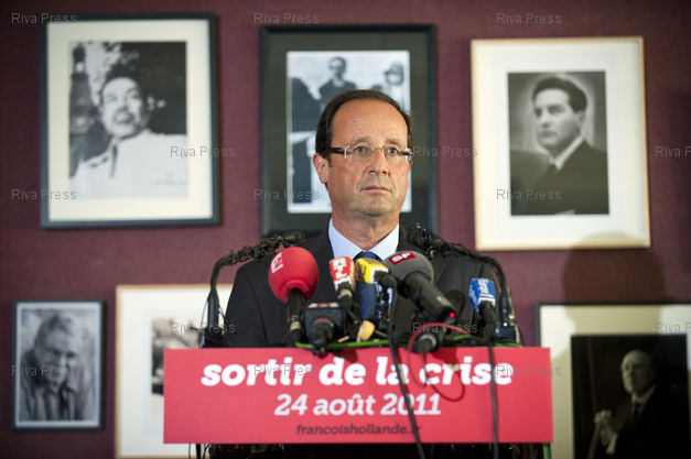 Légende : 24/08/2011 - PARIS, France - Francois Hollande fait une conference de presse a la Maison de l'Amerique Latine, au terme d'une reunion de plusieurs economistes destinee a trouver des pistes pour "sortir de la crise". /// Francois Hollande, candidate for the 2011 Socialist Party primary election before 2012 presidential election, addresses journalists during a press conference focused on the eurozone debt crisis at the Maison de l'Amerique Latine. /// PHOTO Vincent Boisot/Riva Press