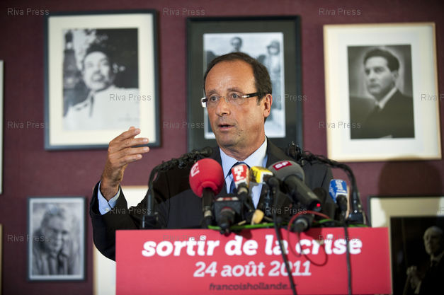 Légende : 24/08/2011 - PARIS, France - Francois Hollande fait une conference de presse a la Maison de l'Amerique Latine, au terme d'une reunion de plusieurs economistes destinee a trouver des pistes pour "sortir de la crise". /// Francois Hollande, candidate for the 2011 Socialist Party primary election before 2012 presidential election, addresses journalists during a press conference focused on the eurozone debt crisis at the Maison de l'Amerique Latine. /// PHOTO Vincent Boisot/Riva Press