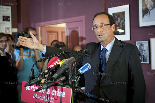Légende : 24/08/2011 - PARIS, France - Francois Hollande fait une conference de presse a la Maison de l'Amerique Latine, au terme d'une reunion de plusieurs economistes destinee a trouver des pistes pour "sortir de la crise". /// Francois Hollande, candidate for the 2011 Socialist Party primary election before 2012 presidential election, addresses journalists during a press conference focused on the eurozone debt crisis at the Maison de l'Amerique Latine. /// PHOTO Vincent Boisot/Riva Press