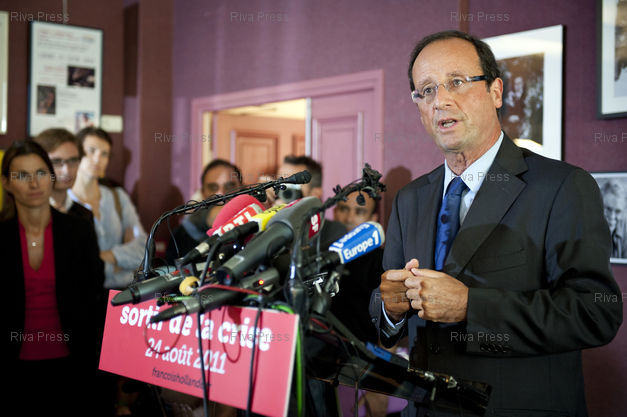 Légende : 24/08/2011 - PARIS, France - Francois Hollande fait une conference de presse a la Maison de l'Amerique Latine, au terme d'une reunion de plusieurs economistes destinee a trouver des pistes pour "sortir de la crise". /// Francois Hollande, candidate for the 2011 Socialist Party primary election before 2012 presidential election, addresses journalists during a press conference focused on the eurozone debt crisis at the Maison de l'Amerique Latine. /// PHOTO Vincent Boisot/Riva Press