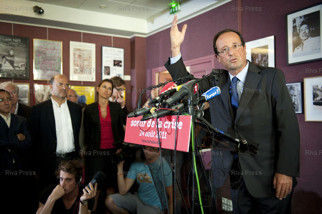 Légende : 24/08/2011 - PARIS, France - Francois Hollande fait une conference de presse a la Maison de l'Amerique Latine, au terme d'une reunion de plusieurs economistes destinee a trouver des pistes pour "sortir de la crise". /// Francois Hollande, candidate for the 2011 Socialist Party primary election before 2012 presidential election, addresses journalists during a press conference focused on the eurozone debt crisis at the Maison de l'Amerique Latine. /// PHOTO Vincent Boisot/Riva Press