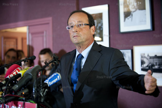 Légende : 24/08/2011 - PARIS, France - Francois Hollande fait une conference de presse a la Maison de l'Amerique Latine, au terme d'une reunion de plusieurs economistes destinee a trouver des pistes pour "sortir de la crise". /// Francois Hollande, candidate for the 2011 Socialist Party primary election before 2012 presidential election, addresses journalists during a press conference focused on the eurozone debt crisis at the Maison de l'Amerique Latine. /// PHOTO Vincent Boisot/Riva Press