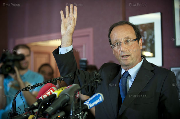 Légende : 24/08/2011 - PARIS, France - Francois Hollande fait une conference de presse a la Maison de l'Amerique Latine, au terme d'une reunion de plusieurs economistes destinee a trouver des pistes pour "sortir de la crise". /// Francois Hollande, candidate for the 2011 Socialist Party primary election before 2012 presidential election, addresses journalists during a press conference focused on the eurozone debt crisis at the Maison de l'Amerique Latine. /// PHOTO Vincent Boisot/Riva Press