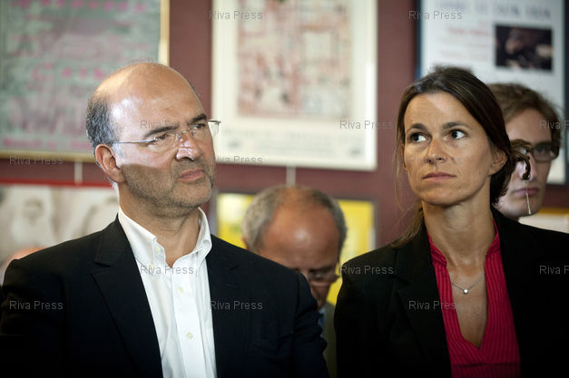 Légende : 24/08/2011 - PARIS, France - Pierre Moscovici et Aurelie Filippetti ecoutent Francois Hollande en conference de presse a la Maison de l'Amerique Latine, au terme d'une reunion de plusieurs economistes destinee a trouver des pistes pour "sortir de la crise". /// Pierre Moscovici and Aurelie Filippetti listen Francois Hollande, candidate for the 2011 Socialist Party primary election before 2012 presidential election, who addresses journalists during a press conference focused on the eurozone debt crisis at the Maison de l'Amerique Latine. /// PHOTO Vincent Boisot/Riva Press