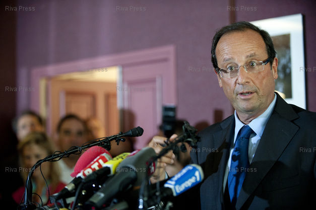 Légende : 24/08/2011 - PARIS, France - Francois Hollande fait une conference de presse a la Maison de l'Amerique Latine, au terme d'une reunion de plusieurs economistes destinee a trouver des pistes pour "sortir de la crise". /// Francois Hollande, candidate for the 2011 Socialist Party primary election before 2012 presidential election, addresses journalists during a press conference focused on the eurozone debt crisis at the Maison de l'Amerique Latine. /// PHOTO Vincent Boisot/Riva Press