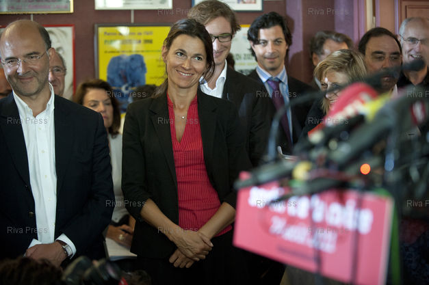 Légende : 24/08/2011 - PARIS, France - Pierre Moscovici et Aurelie Filippetti ecoutent Francois Hollande en conference de presse a la Maison de l'Amerique Latine, au terme d'une reunion de plusieurs economistes destinee a trouver des pistes pour "sortir de la crise". /// Pierre Moscovici and Aurelie Filippetti listen Francois Hollande, candidate for the 2011 Socialist Party primary election before 2012 presidential election, who addresses journalists during a press conference focused on the eurozone debt crisis at the Maison de l'Amerique Latine. /// PHOTO Vincent Boisot/Riva Press