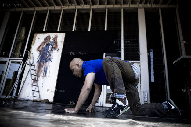 Légende : 29/09/2011 - Antananarivo, MADAGASCAR - Performance artistique du peintre Paul Bloas, du danseur Bernardo Montet et du guitariste Joel Rabesolo. PHOTO : RIJASOLO / RIVA PRESS