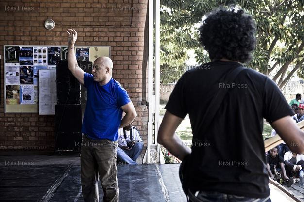 Légende : 29/09/2011 - Antananarivo, MADAGASCAR - Performance artistique du peintre Paul Bloas, du danseur Bernardo Montet et du guitariste Joel Rabesolo. PHOTO : RIJASOLO / RIVA PRESS