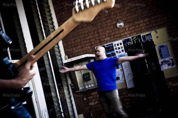 Légende : 29/09/2011 - Antananarivo, MADAGASCAR - Performance artistique du peintre Paul Bloas, du danseur Bernardo Montet et du guitariste Joel Rabesolo. PHOTO : RIJASOLO / RIVA PRESS