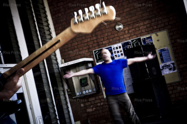 Légende : 29/09/2011 - Antananarivo, MADAGASCAR - Performance artistique du peintre Paul Bloas, du danseur Bernardo Montet et du guitariste Joel Rabesolo. PHOTO : RIJASOLO / RIVA PRESS