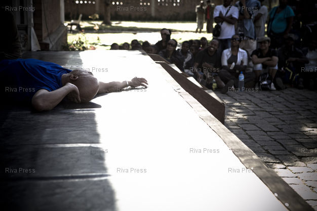 Légende : 29/09/2011 - Antananarivo, MADAGASCAR - Performance artistique du peintre Paul Bloas, du danseur Bernardo Montet et du guitariste Joel Rabesolo. PHOTO : RIJASOLO / RIVA PRESS