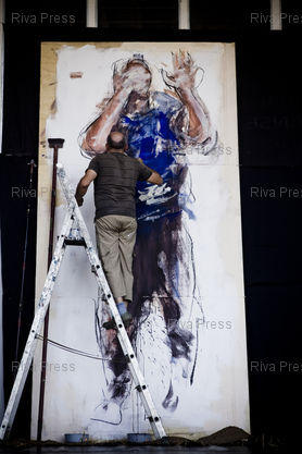 Légende : 29/09/2011 - Antananarivo, MADAGASCAR - Performance artistique du peintre Paul Bloas, du danseur Bernardo Montet et du guitariste Joel Rabesolo. PHOTO : RIJASOLO / RIVA PRESS