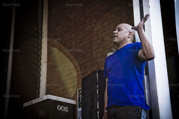 Légende : 29/09/2011 - Antananarivo, MADAGASCAR - Performance artistique du peintre Paul Bloas, du danseur Bernardo Montet et du guitariste Joel Rabesolo. PHOTO : RIJASOLO / RIVA PRESS