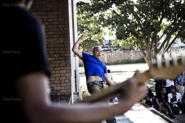 Légende : 29/09/2011 - Antananarivo, MADAGASCAR - Performance artistique du peintre Paul Bloas, du danseur Bernardo Montet et du guitariste Joel Rabesolo. PHOTO : RIJASOLO / RIVA PRESS