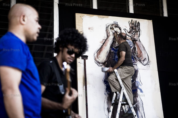 Légende : 29/09/2011 - Antananarivo, MADAGASCAR - Performance artistique du peintre Paul Bloas, du danseur Bernardo Montet et du guitariste Joel Rabesolo. PHOTO : RIJASOLO / RIVA PRESS