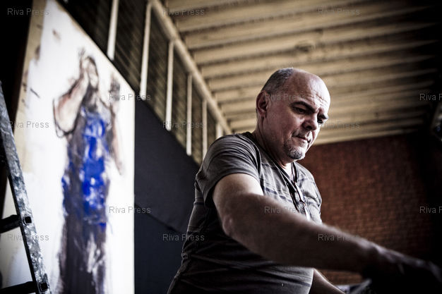 Légende : 29/09/2011 - Antananarivo, MADAGASCAR - Performance artistique du peintre Paul Bloas, du danseur Bernardo Montet et du guitariste Joel Rabesolo. PHOTO : RIJASOLO / RIVA PRESS