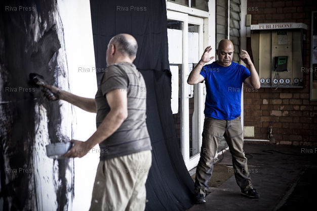 Légende : 29/09/2011 - Antananarivo, MADAGASCAR - Performance artistique du peintre Paul Bloas, du danseur Bernardo Montet et du guitariste Joel Rabesolo. PHOTO : RIJASOLO / RIVA PRESS