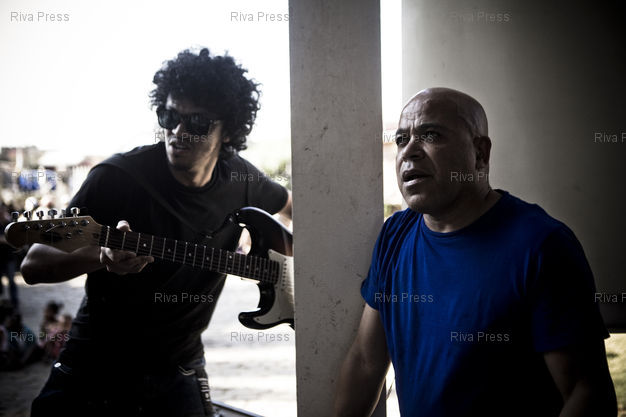 Légende : 29/09/2011 - Antananarivo, MADAGASCAR - Performance artistique du peintre Paul Bloas, du danseur Bernardo Montet et du guitariste Joel Rabesolo. PHOTO : RIJASOLO / RIVA PRESS