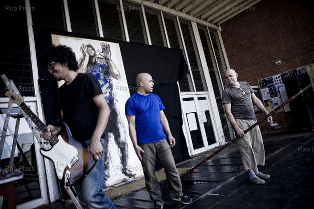 Légende : 29/09/2011 - Antananarivo, MADAGASCAR - Performance artistique du peintre Paul Bloas, du danseur Bernardo Montet et du guitariste Joel Rabesolo. PHOTO : RIJASOLO / RIVA PRESS