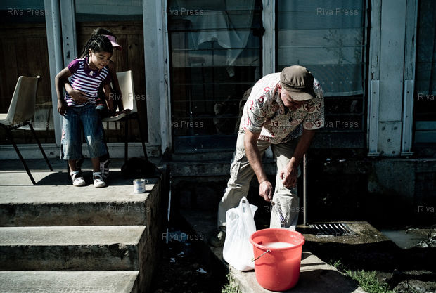 Légende : 30/09/2011 - Antananarivo, MADAGASCAR - Paul Bloas colle ses "géants" dans le quartier d'Ampefiloha à Antananarivo. PHOTO : RIJASOLO / RIVA PRESS