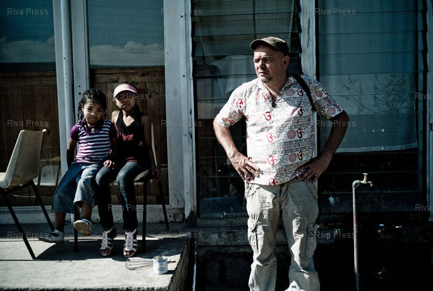 Légende : 30/09/2011 - Antananarivo, MADAGASCAR - Paul Bloas colle ses "géants" dans le quartier d'Ampefiloha à Antananarivo. PHOTO : RIJASOLO / RIVA PRESS