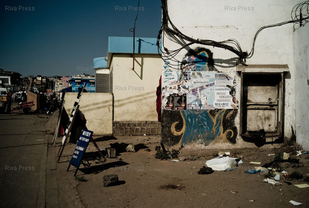 Légende : 30/09/2011 - Antananarivo, MADAGASCAR - Paul Bloas colle ses "géants" dans le quartier d'Ampefiloha à Antananarivo. PHOTO : RIJASOLO / RIVA PRESS
