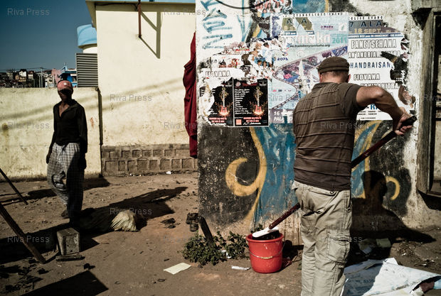 Légende : 30/09/2011 - Antananarivo, MADAGASCAR - Paul Bloas colle ses "géants" dans le quartier d'Ampefiloha à Antananarivo. PHOTO : RIJASOLO / RIVA PRESS