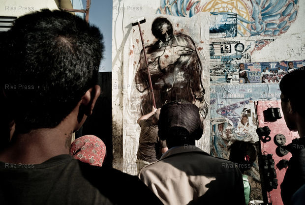 Légende : 30/09/2011 - Antananarivo, MADAGASCAR - Paul Bloas colle ses "géants" dans le quartier d'Ampefiloha à Antananarivo. PHOTO : RIJASOLO / RIVA PRESS