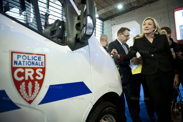 Légende : 19/10/2011 - PARIS, France - La presidente et candidate du Front National pour l'election presidentielle 2012 visite le salon Milipol, dedie a la securite interieure des etats. /// The president of French far-right party Front National and candidate for the 2012 French presidential election Marine Le Pen visits the Milipol worldwilde exhibition dedicated to internal state security. /// PHOTO Vincent BOISOT/Riva Press