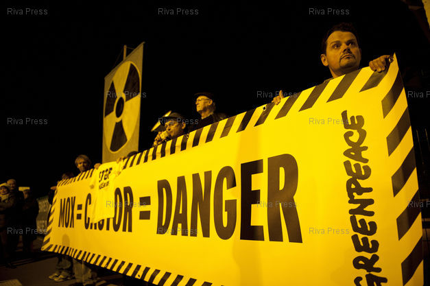 Légende : 22/11/2011 - VALOGNES, France - Des militants anti-nucleaire manifestent devant la gare de Valognes d'ou doit partir le lendemain un train castor de dechets nucleaires a destination de l'Allemagne. /// Anti-nuclear demonstrators protest against a planned castor container tranport of nuclear waste. /// PHOTO Vincent BOISOT/Riva Press