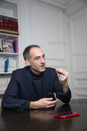 Légende : Le depute europeen et essayiste Raphael Glucksmann repond aux questions d'une journaliste a Paris. Le 21/12/2023 /// Member of European Parliament and essayist Raphael Glucksmann answers questions from a journalist in Paris. On December 21, 2023 /// PHOTO Vincent Boisot
