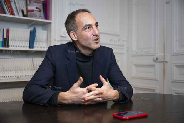 Légende : Le depute europeen et essayiste Raphael Glucksmann repond aux questions d'une journaliste a Paris. Le 21/12/2023 /// Member of European Parliament and essayist Raphael Glucksmann answers questions from a journalist in Paris. On December 21, 2023 /// PHOTO Vincent Boisot