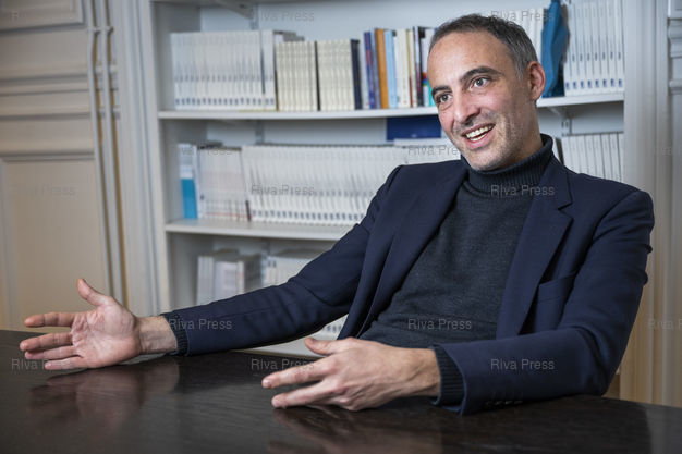 Légende : Le depute europeen et essayiste Raphael Glucksmann repond aux questions d'une journaliste a Paris. Le 21/12/2023 /// Member of European Parliament and essayist Raphael Glucksmann answers questions from a journalist in Paris. On December 21, 2023 /// PHOTO Vincent Boisot