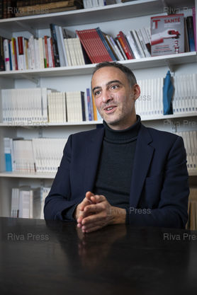Légende : Le depute europeen et essayiste Raphael Glucksmann repond aux questions d'une journaliste a Paris. Le 21/12/2023 /// Member of European Parliament and essayist Raphael Glucksmann answers questions from a journalist in Paris. On December 21, 2023 /// PHOTO Vincent Boisot