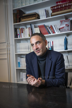 Légende : Le depute europeen et essayiste Raphael Glucksmann repond aux questions d'une journaliste a Paris. Le 21/12/2023 /// Member of European Parliament and essayist Raphael Glucksmann answers questions from a journalist in Paris. On December 21, 2023 /// PHOTO Vincent Boisot