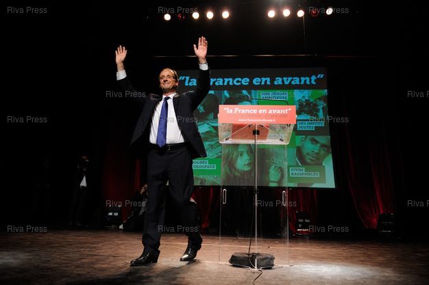 Légende : Premier meeting de campagne de Francois Hollande, candidat à la primaire du parti socialiste - Theatre Rutebeuf.