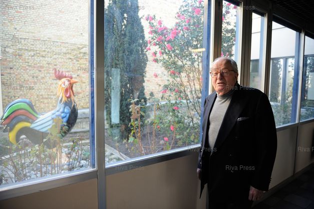Jean-Marie Le Pen, dans les couloirs du 'Carre', siege du Front National, avec en arriere-plan le coq achete au Salon de l'Agriculture - Photo © Lionel Préau +33 (0)6 68 12 83 77